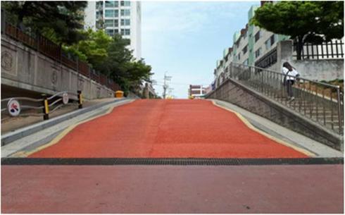 미끄럼방지시설은 사고가 잦은 급경사지·내리막길에 설치하여, 폭설·폭우 상황에서도 차량의 안전운행에 도움을 주는 시설이다. 현재 급경사지 총 5개소에 설치를 완료 했으며, 운전자가 보행자를 인지하기 쉽도록 도로에 색을 입혔다.