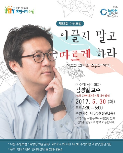 제83회 수원포럼 강사로 나서는 김경일 아주대학교 심리학과 교수는 ‘변하지 않는 인간을 어떻게 어르고 달래야 하는가’를 알려준다. ‘이끌지 말고 따르게 하라’는 주제로 강의하는 김 교수는 일정한 방향으로 인간의 행동을 유도하는 방법을 소개한다. 포럼은 30일 오후 4시 30분 수원시청 대강당에서 열린다.