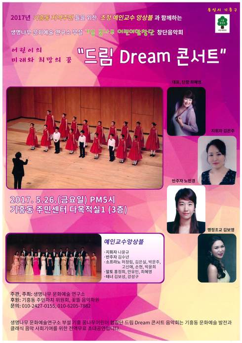 기흥꿈나무어린이합창단은 생명나무문화예술연구소 부설 단체로 기흥지역 어린이들에게 보다 폭넓은 음악활동을 제공하고 음악으로 나눔을 실천하기 위해 지난해 9월 창단했다. 단원은 기흥·공세초등학교생 18명으로 구성됐다.