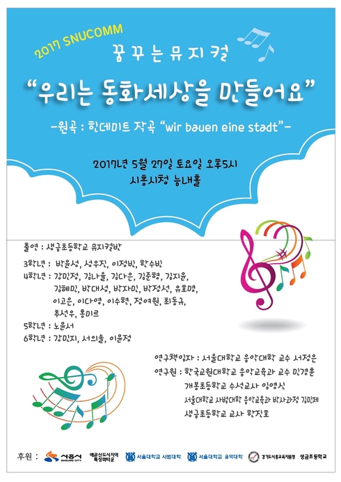 ‘꿈꾸는 뮤지컬’은 시흥시와 서울대 사범대가 진행 중인 교육협력센터의 관내 학교 시범운영을 위해 적용하는 음악 프로그램으로, 지난 2월부터 4개월 동안 생금초등학교 학생들의 열정으로 하나하나 채워진 공연이다.