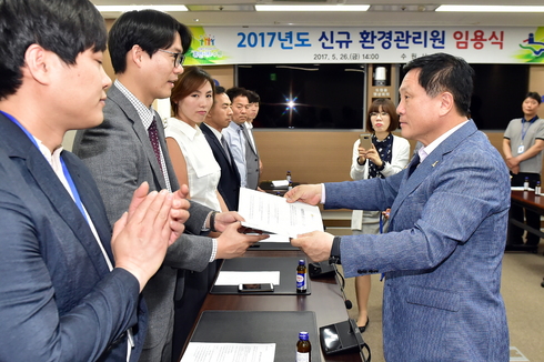 [시사인경제] 수원시는 26일 수원시청에서 2017년도 신규 환경관리원 임용식을 열고 15명에게 임용장을 교부했다.