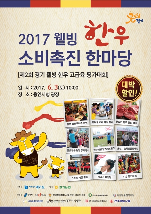 [시사인경제] 경기도는 경기도의 명품 한우고기를 직접 맛보고 경제적인 가격에 구입해볼 수 있는 ‘2017 웰빙 한우 소비촉진 한마당 행사’가 오는 6월 3일 오전 10시부터 용인시청 광장에서 개최된다고 밝혔다.