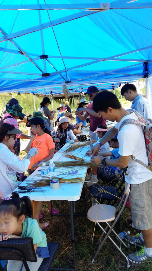 | 지난해 6월 우리밀 수확 체험 행사 때 시민들이 밀짚으로 여치집 액자 등을 만들고 있다 |