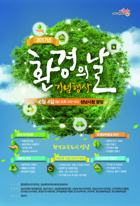 성남시와 분당환경시민의 모임, 성남환경교육네트워크는 이날 오후 1시부터 5시까지 시청 너른못 광장에 5가지 주제의 환경행사장을 마련한다고 밝혔다.