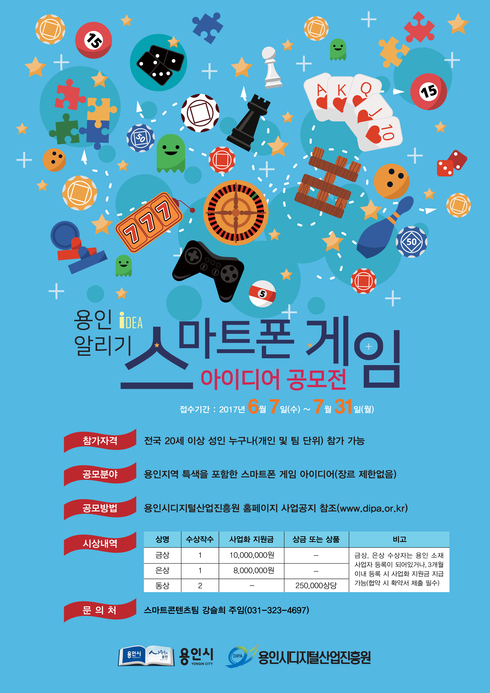 용인시는 디지털산업진흥원에서 용인을 알리는 스마트폰 게임 공모전을 개최키로 하고 7월31일까지 작품을 접수한다고 밝혔다. 스마트폰 게임을 통해 용인의 특색을 알리는 동시에 게임 관련 우수한 인력을 발굴하기 위해서다.