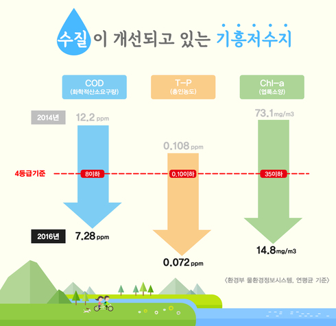 용인시는 환경부 물환경정보시스템에 따르면 지난해 기흥저수지의 연평균 수질(중류기준)이 COD가 7.28ppm, T-P가 0.072ppm을 기록, 농업용수 수준(4등급)인 8이하와 0.1이하에 각각 만족했다고 밝혔다.