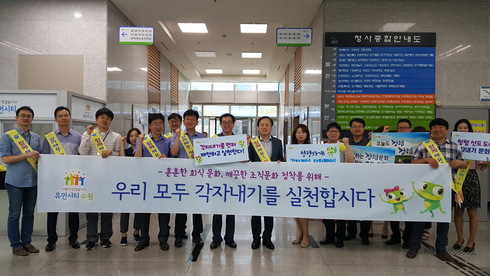 [시사인경제] 수원시가 9일 오전 수원시청에서 출근하는 공직자들을 대상으로 청탁금지법(김영란법) 안착을 위한 ‘각자 내기 실천 캠페인’을 전개했다고 밝혔다.