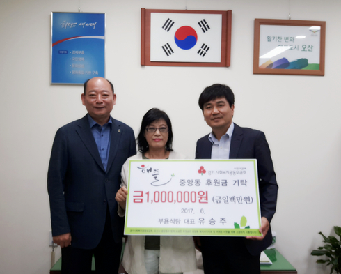 [시사인경제] 오산시 중앙동 행정복지센터는 오색시장 내 맛집으로 유명한 부용식당이 관내 어려운 이웃을 위해 써달라며 후원금 100만원을 지난 20일 중앙동에 기탁했다고 밝혔다.