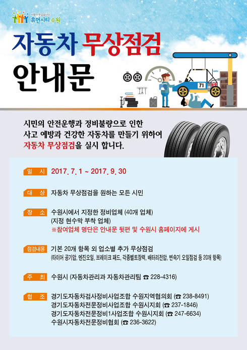 [시사인경제] 수원시는 오는 7월 1일부터 9월 30일까지 관내 40개 지정 정비업체에서 자동차 무상점검 서비스를 시행한다고 밝혔다.