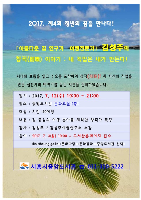 [시사인경제] 시흥시 중앙도서관은 오는 7월 12일 저녁 7시, 중앙도서관 문화교실에서 ‘아름다운 길 연구가‘김성주 소장의 창직 이야기 특강을 운영한다고 밝혔다.