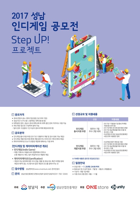 성남 차세대융합콘텐츠 캠퍼스 개소에 맞춰 추진하는‘2017 성남 인디게임 공모전 - Step up! 프로젝트’는 인디게임 개발자들이 겪는 개발, 출시, 홍보의 어려움에서 한 발 나아갈 수 있도록 지원하며, 성남시와 성남산업진흥재단이 주최, 주관하고 원스토어(주)와 유니티 테크놀로지스 코리아가 홍보·마케팅 등을 후원한다.