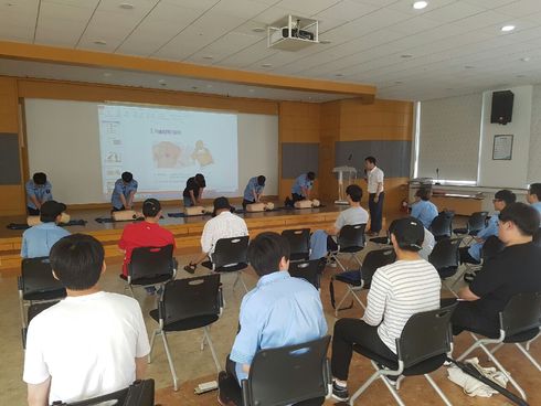 이날 교육은 대한적십자사에서 파견된 전문 강사가 심정지 등의 응급환자 발생시 4분이 넘기 전에 심폐소생술을 시행할 수 있도록 이론교육과 실습, 자동제세동기 사용법 등을 지도했다.