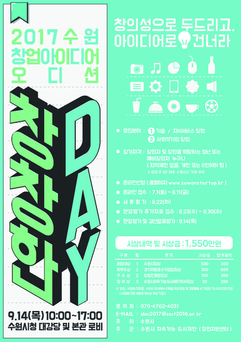 신청은 ‘2017 수원 창업 아이디어 오디션’ 홈페이지(http://www.suwonstartup.kr)에서 할 수 있다. 문의 : 070-4762-4031, 수원시지속가능도시재단 창업지원센터