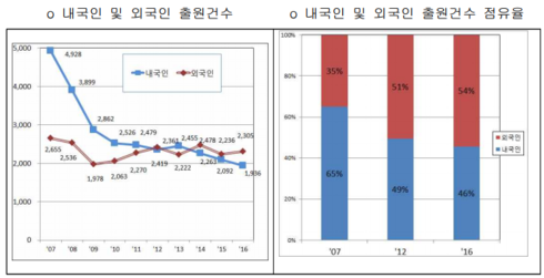 이 중 외국인의 특허출원건수는 동기간 매년 2,000건 내외로 유지돼 온 반면, 내국인의 특허출원건수는 2007년 4,928건 대비 2016년 1,936건인 절반이하로 급감해왔다.