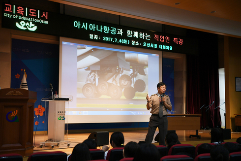 이번 특강은 관내 중학교 1학년 학생들을 대상으로 아시아나 항공의 교육기부 봉사단을 초청해 항공정비사, 항공조종사, 승무원의 직업에 대해 알아보는 시간을 가졌으며, 퀴즈 및 질의응답 시간을 통해 막연했던 항공분야 직업에 대해 좀 더 친밀하게 느끼고 자세히 알 수 있도록 강의 내용이 구성됐다.