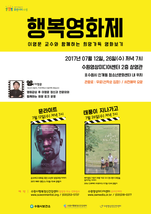 [시사인경제] 수원시행복정신건강센터와 수원영상미디어센터는 오는 12일과 26일 저녁 7시 영상미디어센터 2층 은하수홀에서 정신건강의학과 전문의 이영문 교수와 함께 하는 ‘행복영화제’를 연다고 밝혔다.