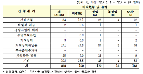 2017년 상반기 분쟁 조정의 주요 특징은 일반불공정거래와 가맹사업거래 사건 접수, 처리 건수가 크게 증가하고 있다는 것이다.