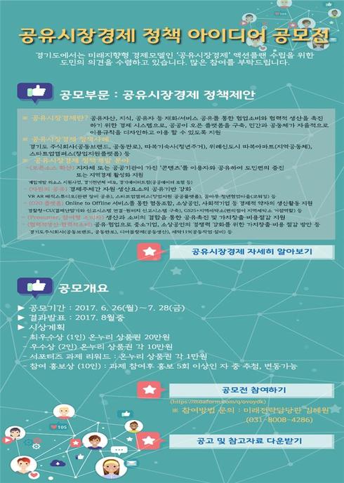 이번 공모전은 경기도 대표 제안채널 트위그(http://cafe.naver.com/ gideain)와 온라인(https://moaform.com/q/ovoydk)을 통해 공유시장경제 관련 아이디어가 있는 누구나 참여할 수 있다.