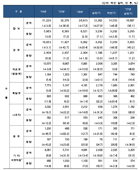 2017년 상반기 석유제품 수출액은 166억 9천만 달러로 전년동기대비 36.1% 증가하며 2015년 하반기(156억 달러) 이후 반기 최대 수출액을 기록했다.