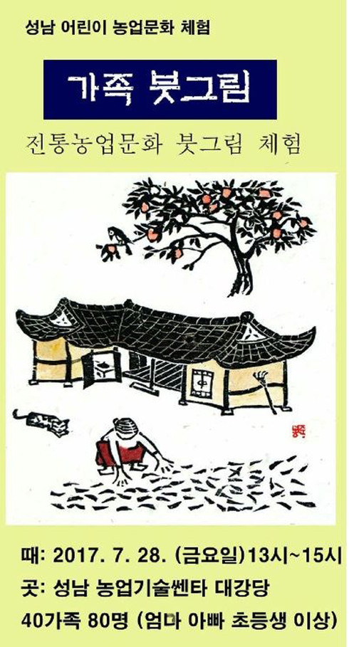 전통 황모필 붓으로 닥종이에 농촌의 이미지를 자유롭게 그려 가족 공동체 작품을 완성하는 체험이다.