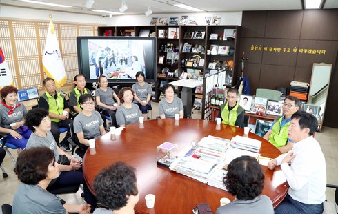 간담회에서 미화원 A씨는 “청사내 미화원 대기실이 환기가 잘 되지 않아 공기청정기와 에어컨 등 환기시설을 보완해 줬으면 좋겠다”고 건의했다. 또 다른 미화원 B씨는 “현재 용역회사에서 1년 단위로 계약을 맺고 근무하고 있는데 고용보장이 좀더 안정적으로 됐으면 좋겠다”고 말했다.