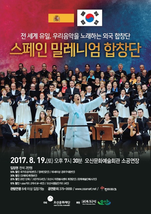 [시사인경제] 오산시는 스페인을 중심으로 전 세계에 한국 음악을 전파하고 있는 ‘스페인 밀레니엄 합창단 내한공연’이 오는 19일 오후 7시 30분 오산문화예술회관 소공연장에서 펼쳐진다고 전했다.