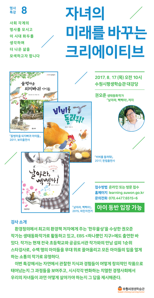 이날 강연하는 권오준 생태동화작가는 자연에서 관찰로 얻은 지식과 경험들이 창의적 작품으로 재탄생하는 과정을 보여주고, 경쟁사회에서 아이들이 어떻게 살아가야 하는지 길을 제시할 예정이다.