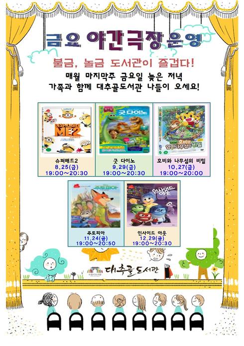 12월까지 대추골도서관 금요야간극장에서는 ‘굿 다이노’(9월 29일), ‘호비와 엄마나무섬의 비밀’(10월 27일), ‘주토피아’(11월 24일), ‘인사이드아웃’(12월 29일)이 상영될 예정이다. 사전 예약 없이 누구나 참여할 수 있다.