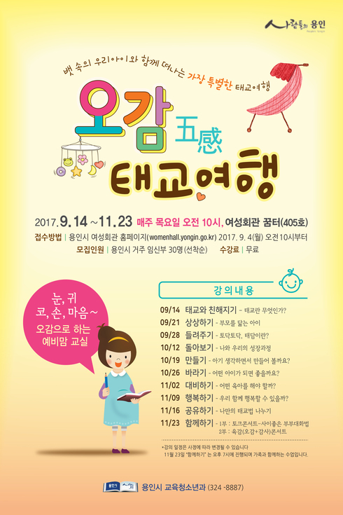 [시사인경제] 용인시는 임산부들이 오감활동을 통해 태아와 친밀감을 형성하고 부모가 될 준비를 할 수 있도록 돕는 ‘오감태교여행’ 강좌를 개설해 오는 9월 4일부터 선착순으로 수강생을 모집한다고 밝혔다.