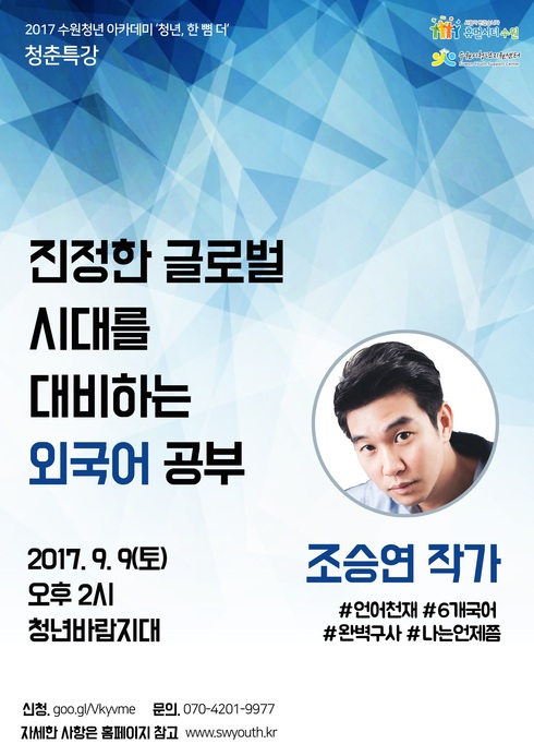 수원시청년지원센터가 오는 9월 9일 오후 2시 청년바람지대 가지가지홀에서 조승연 작가의 청춘특강 ‘진정한 글로벌 시대를 대비하는 외국어 공부’를 연다.