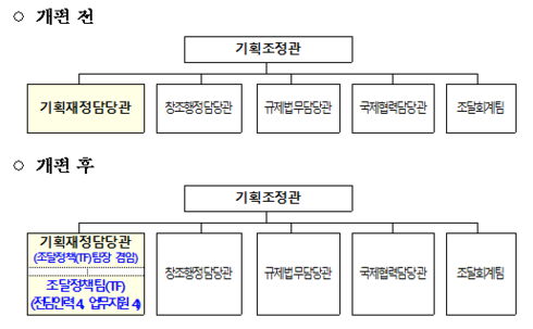 ‘조달정책팀’은 총 9명으로 기획조정관실에 설치되는데, 기획재정담당관이 팀장을 겸임하고 4명의 전담인력과 예산, 조직, 인사 등 분야에서 4명의 지원인력으로 구성해 정책실행력을 최대한 확보하도록 했다.