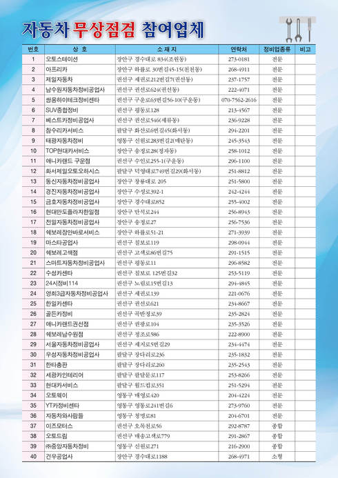 이번 무상점검 서비스에는 수원자동차정비협회·경기도자동차검사정비사업조합(수원시지회) 등에서 추천한 정비업체 중 수원시가 심사를 거쳐 선정한 40개 업체가 참여하고 있다.