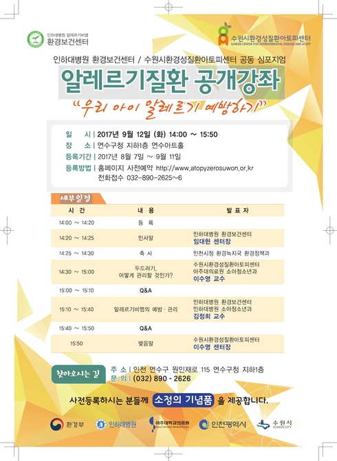 수원시 환경성질환아토피센터는 시민들에게 아토피피부염·알레르기 등 각종 환경성 질환에 대한 올바른 정보를 제공하고자 지난 2014년 인하대학교병원 환경보건센터와 업무협약을 맺고 해마다 무료 공개강좌를 열어오고 있다.