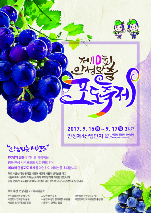 [시사인경제] 제10회 안성포도축제가 오는 15일부터 17일까지 안성 제4산업단지 특설무대에서 열린다. 15일은 오후 한시부터 포도판매장이 열리며 16, 17일 이틀동안 개막식을 비롯한 본행사가 시작된다.