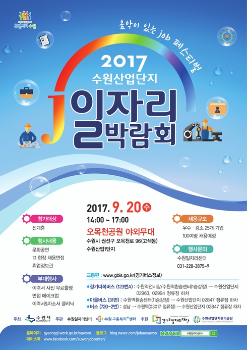 수원시는 오는 20일 오후 2∼5시 수원산업단지 내 오목천공원(권선구 고색동) 야외무대에서 ‘2017 수원산업단지 일자리박람회’를 개최한다.