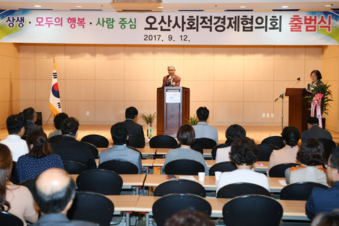 이날 출범식에는 오산시장 및 오산시의회 의장, 경기도 따복공동체 지원센터의 센터장 등 내빈과 사회적경제 기업 대표 등 70여명이 참석해 사회적경제 협의회 출범을 축하했다.