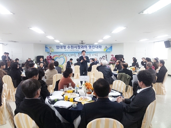 【경기인뉴스】임성택 기자 = 염태영 수원시장은 지난 30일 인계동 주민센터를 방문해 도의원, 시의원,단체장, 주민 대표 등 60여명이 참석한 가운데 2013년 시정 운영 방향인 『따뜻한 수원, 더 반가운 사람』실현을 위한 주민과의 열린 대화의 시간을 가졌다. 염태영 수원시장은 먼저 10구단 kt 유치 확정에 따른 수원시민의 결집 능력과 응원에 대하여 칭찬을 아끼지 않았으며, 그간의 부채절감, 보편적 복지 추진 등 추진 성과와 계획을 브리핑하자 주민들로부터 큰 박수가 터져나왔다. 이어진 주민과의 대화에서는 자유로운 분위기 속에서 평소 시정에 궁금한 사항을 주민들이 묻고 시장이 답하는 형식으로 대화가 진행되었다.열린 대화를 마친 염태영 수원시장은 동대본부, 문고, 주민센터를 방문하고 마지막으로 동직원과의 오찬의 시간을 가져 최일선에서 근무하는 동 주민센터 직원들을 격려하였다.