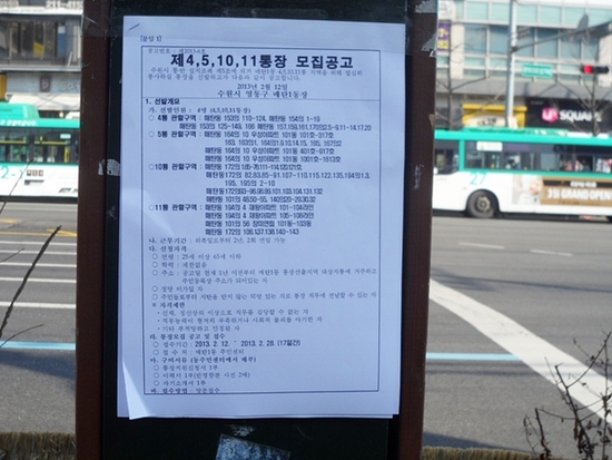 【경기인뉴스】임성택 기자 = 영통구 매탄1동(동장 김교원)에서는 2월 12일부터 2월 28일까지 통장을 대거 모집한다. 수원시 통․반 설치조례 제5조에 의하여 매탄1동 제4통, 5통, 10통, 11통 지역을 위해 열심히 봉사할 통장을 선발하고자 공개모집 공고 중이다.통장 근무기간은 위촉일로부터 2년으로 2회 연임이 가능하며, 신청자격은 25세 이상 65세 이하로 공고일 현재 1년 이전부터 매탄1동 통장선출지역 대상지 통에 거주하고 주민등록상 주소가 되어 있어야 하며 정당 미가입자이어야 한다. 주민들로부터 지탄을 받지 않는 덕망 있는 자로 통장 직무에 전념할 수 있는 자이면 누구나 지원할 수 있다.구비서류는 주민센터에서 배부하며 통장지원신청서와 이력서, 자기소개서를 제출하며 방문 접수 가능하다.통장의 임무는 통․반 관할 지역주민의 생활지원, 통․반 행정수행 제반사실 확인, 통․반 주민의 민방위 훈련(민방위 통대장) 등 기타 법령에 의하여 부여된 업무 및 동행정 수행에 필요한 사항의 임무가 있다.매탄1동 통장공개모집 선발 방법은 1차 서류심사 후 2인 이상 지원 신청 시 심사위원 심사가 있으며 심사위원회에서 선발할 예정이다.AQ김교원 매탄1동장은 이번 공고를 통해 공개모집으로 선발 된 통장들과 지역발전을 위해 노력해 나갈 것이라며 포부를 밝혔다.