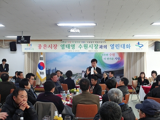 【경기인뉴스】이연수 기자 = 염태영 수원시장은 지난27일 고등동 주민센터를 방문하여 “따듯한 수원, 더 반가운 사람” 실현을 위해 주민과의 열린대화의 시간을 가졌다.이날 행사는 2013년 계사년 새해를 맞아 변화와 희망의 도시로 도약하는 수원의 시정운영 방향을 제시하고 각계각층의 다양한 시민들과의 열린 대화를 통하여 주민들의 여러 고충과 의견을 듣기 위해 실시한 것으로 도․시의원, 유관단체장, 주민대표 등 70명에 가까운 주민들이 참석하여 열띤 대화의 시간을 가졌다.이번 대화에서는 고등주거환경개선사업지구와 재개발지구의 조속한 공사추진과 고충을 해결해 달라는 주문이 있었고 시장님께서는 다각도로 문제를 해결하기 위해 노력하겠다는 긍정적인 답변이 있었다.열린대화를 마친 염태영 시장은 동대본부, 주민자치센터, 새마을문고를 방문한 후 고등동 직원과의 오찬 시간을 갖고 직원들을 격려했다.