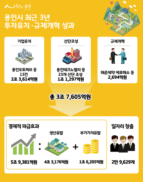 분석에 따르면 용인시가 이 기간 동안 투자를 유치한 금액은 용인오토허브자동차서비스복합단지 등 13건의 기업유치로 2조3,614억원, 용인테크노밸리 등 23개 산업단지 조성으로 1조1,297억원, 각종 규제개혁으로 2,694억원에 달했다.