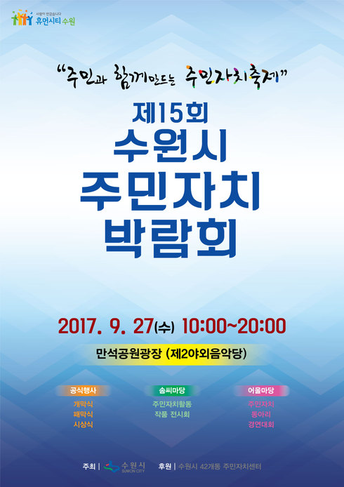 [시사인경제] 수원시는 오는 27일 오전 10시 송죽동 만석공원 광장에서 ‘제15회 수원시 주민자치박람회’를 연다.
