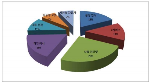 주요 기술별 출원 동향을 살펴보면, 사물 인터넷 분야의 인공지능 기술 62건(25%), 인공지능 개인 비서 45건(18%), 인공지능 음성 인식 45건(18%), e커머스 35건(14%), 의료·건강 분야의 인공지능 기술 27건(11%) 순으로, 음성인식을 통한 인공지능 제어 기술은 특정 분야에 집중되지 않고 다양한 분야에 적용되고 있는 것으로 파악됐다.