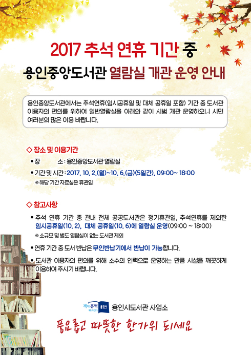| 2017 추석연휴 기간 중 용인중앙도서관 열람실 개관 운영 안내 |