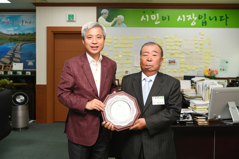곽상욱 시장은 집무실에서 전(前) 초평동 통장이었던 백봉길씨를 1일 명예시장으로 위촉하고 환담을 나누며 명예시장으로서의 임무를 성실히 이행해 줄 것을 당부했다.