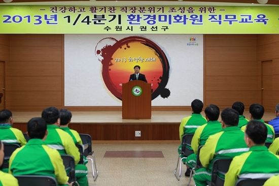 【경기인뉴스】채의선 기자 = 수원시 권선구(구청장 김정수)에서는 지난 28일 건강하고 활기찬 직장분위기 조성을 위해 환경미화원 72명을 대상으로 건강교육을 실시했다고 밝혔다.건강과 행복을 위한 밝은빛웃음치유연구소 약산 정구영교수를 초청해 가로청소 업무가 어렵고 힘들지만 건강을 잃지 않고 활기차게 근무할 수 있는 건강유지 운동 등 일상생활 쉽게 할 수 있는 운동법 등을 강의했다. 업무가 종료된 후에 실시된 교육이라 피곤할 법도 한데 교육에 참여한 환경미화원들은 건강을 위한 가벼운 운동 시범을 따라 하기도 했다.김정수 권선구청장은 한창 개발이 진행되고 있는 권선구라 청소취약지가 많음에도 불구하고 가로청소를 위해 헌신해온 환경미화원들의 노고를 치하했으며, “5월 1일부터 실시예정인 무단투기 쓰레기 미수거 및 분리수거 미실시 생활폐기물 반입정지 추진과 관련해 대민접촉의 기회가 많은 미화원들을 통해 주민홍보 및 계도에 앞장서고, 안전하고 건강하게 청소업무를 추진할 것"을 당부했다.