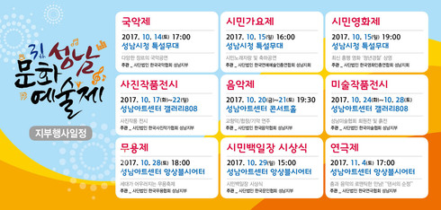 개최 날짜와 장소는 ▲국악제=10월 14일 오후 5시. 성남시청 특설무대 ▲시민가요제=10월 15일 오후 4시. 성남시청 특설무대 ▲시민영화제 ‘청년경찰’ 상영=10월 15일 오후 7시. 성남시청 특설무대 ▲사진작품 전시=10월 17∼22일. 성남아트센터 갤러리 ▲음악제=10월 20∼21일 오후 7시 30분. 성남아트센터 콘서트홀 ▲미술작품 전시=10월 24∼28일. 성남아트센터 갤러리 ▲무용제=10월 28일 오후 6시. 성남아트센터 앙상블시어터 ▲시민백일장 시상식=10월 29일 오후 3시. 성남아트센터 앙상블시어터 ▲연극제 ‘댄서의 순정’ 공연=11월 4일 오후 5시. 성남아트센터 앙상블시어터 등이다.