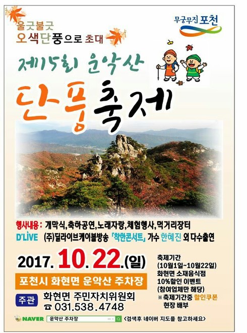 특히나 금년에는 운악산을 찾는 방문객에게 축제 리플렛에 있는 할인쿠폰을 소지한 경우, 화현면 관내 음식점 10%할인 참여업체(15개소)에서 식사에 한해 10% 할인된 가격으로 만나 볼 수 있다. 할인기간은 10.22까지 진행할 예정이다.