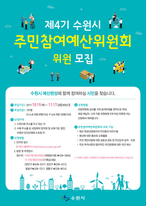 [시사인경제] 수원시가 2018년 주민참여예산제를 이끌어갈 제4기 주민참여예산 위원 159명을 19일부터 공개 모집한다.