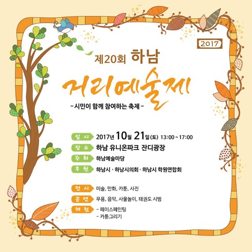 제20회를 맞이하는 이번 하남거리예술제는 지역내 예술인들 뿐만 아니라 청소년, 동호회원, 하남시학원연합회에서 사물놀이 공연과 태권도 시범, 무용, 다양한 음악공연을 비롯해 사진 전시, 미술 전시, 특별 미술전, 만화, (사)한국카툰협회의 카툰전시가 있다.