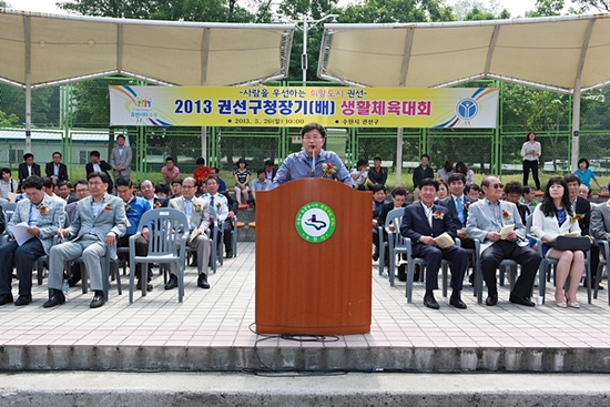 【경기인뉴스】채의선 기자 = 수원시 권선구(구청장 김정수)가 주최하고 8개 종목별 생활체육연합회가 주관한 2013년 권선구청장기(배) 생활체육대회가 지난 26일 성황리에 개최됐다.3,000여명의 선수들이 참여하여 권선구 생활체육인의 화합과 단결을 도모하는 장이 된 이번 대회는 지난 26일 여기산공원 축구장을 비롯한 7개 장소에서 진행되었으며, 개회식에는 국회의원, 시의회 부의장, 도․시의원, 수원시 생활체육회장, 생활체육종목별 연합회장, 구 단위 단체장 등이 참석한 가운데 8개 종목에 참가한 선수들 모두가 필승을 다짐했다.개회식 대회사에서 김정수 권선구청장은 “오늘 체육대회를 통하여 그동안 갈고 닦은 기량을 정정당당하게 마음껏 발휘하여 권선구 생활체육인의 화합과 단결을 도모하고 사람을 우선하는 희망도시 권선을 만드는 데에도 적극적인 참여와 관심을 당부드리고 무엇보다 경기 중 안전에 특별히 유의해 주시길 바란다는 당부를 아끼지 않았다.통합 개회식 후 축구, 게이트볼, 탁구, 줄넘기, 테니스, 볼링, 족구, 풋살 등 8개 종목별 경기장에서 대회가 펼쳐졌으며 김정수 구청장은 종목별 경기장을 순회하며 참가선수들을 격려했다.
